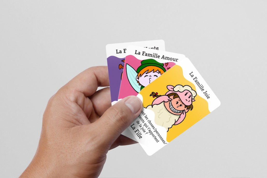Un jeu des 7 familles avec des cartes coloriées figurant des personnages issus des histoires personnalisées Mon Monde à Moi.